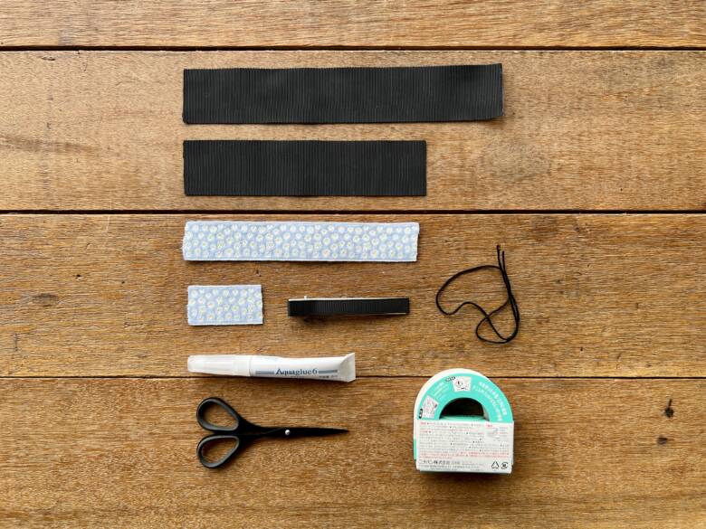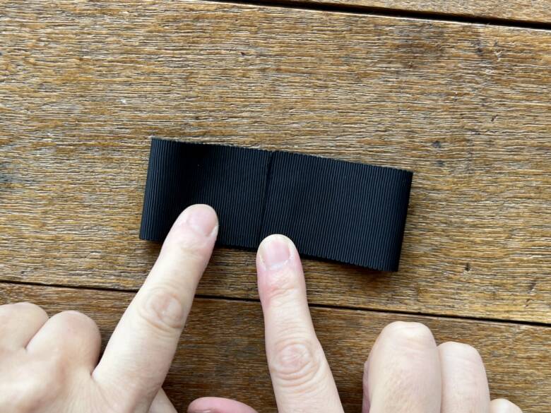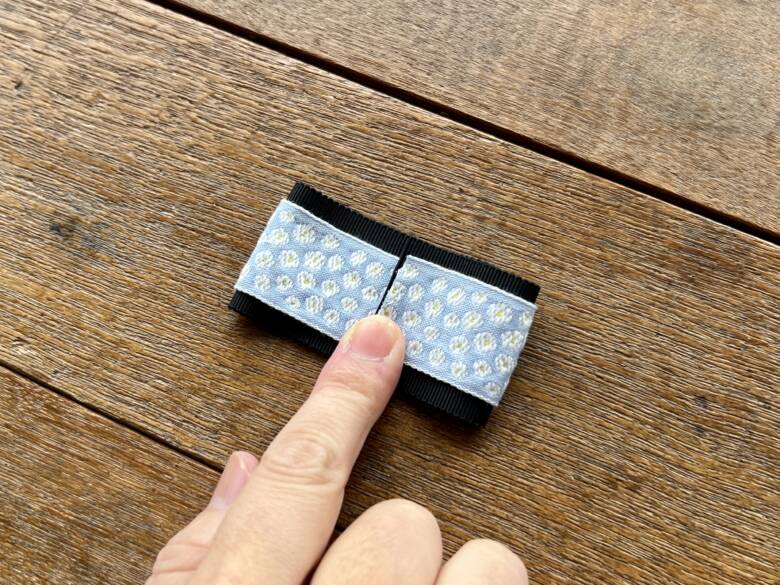 ②16cmのグログランテープに16cmのマーガレットリボンを両面テープで貼り、折ります。