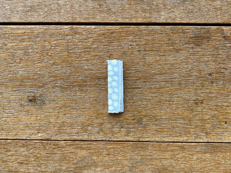 ④5cmのマーガレットリボンの裏に両面テープを貼り、縦半分(きっちり半分にしない方が味がでます笑)にします。