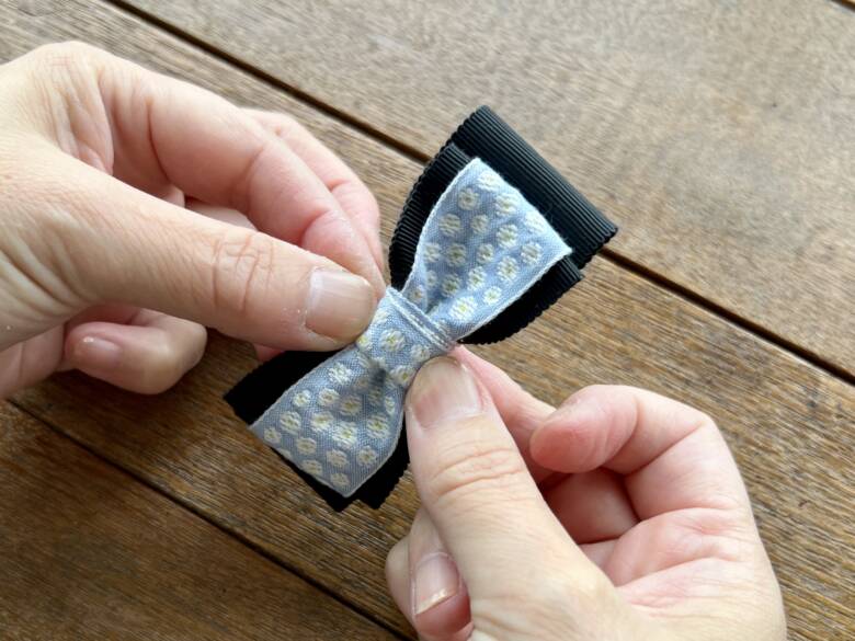 ③ ①の上に②を重ね、りぼん型にし、中央を糸で固定します。