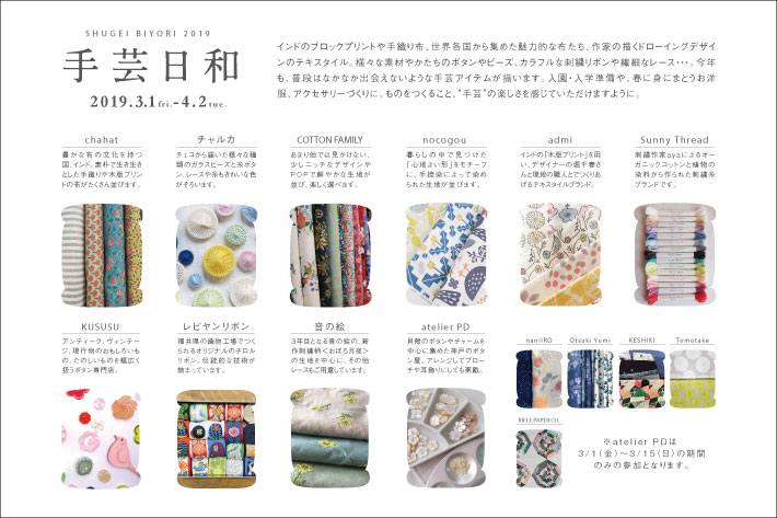 イベント名が”手芸日和”というだけあって、レピヤンリボンのほかにも、生地やボタンなど、多数展開中とのこと。