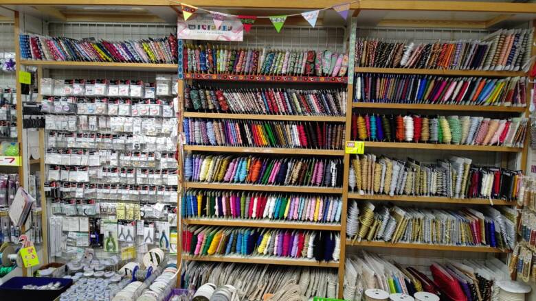 ボタン各種・ファスナー・装飾テープ・糸・針・刺繍材料・リボン各種・アクセサリーパーツ・量り売りビーズ・スパンコール・フェルト・型紙等々・・・