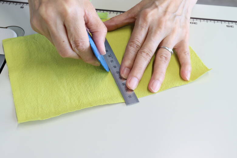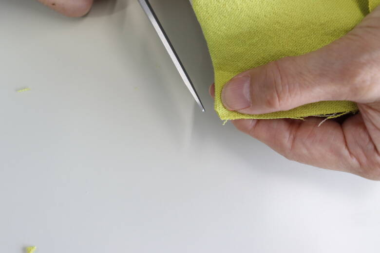 ポーチの縦の長さの半分の位置に小さな切れ目を入れておきます。待ち針で止めたりチャコで印を付けてもOKですよ。
