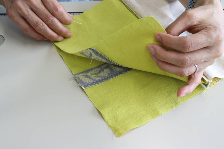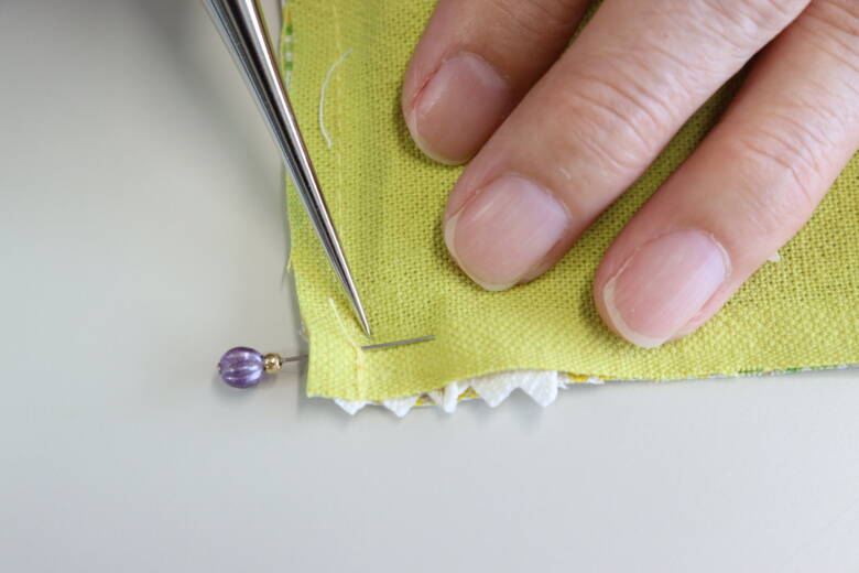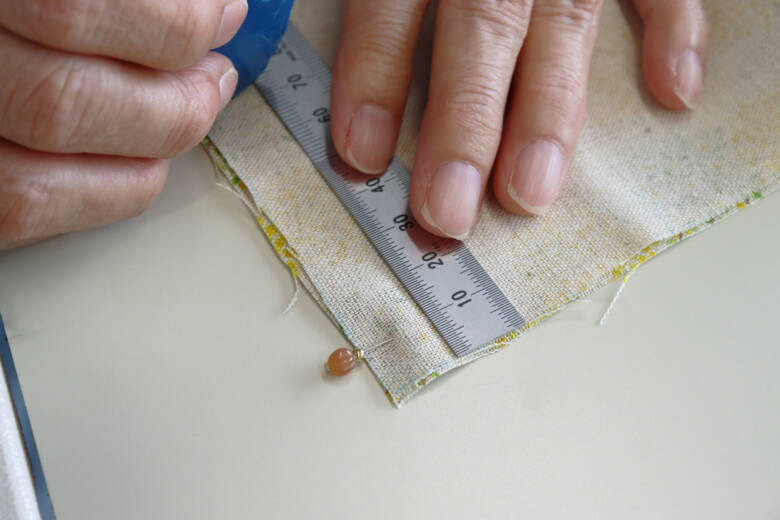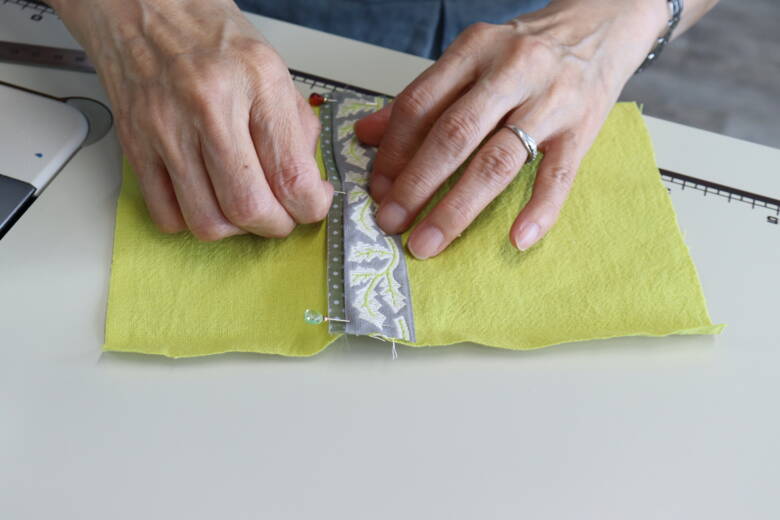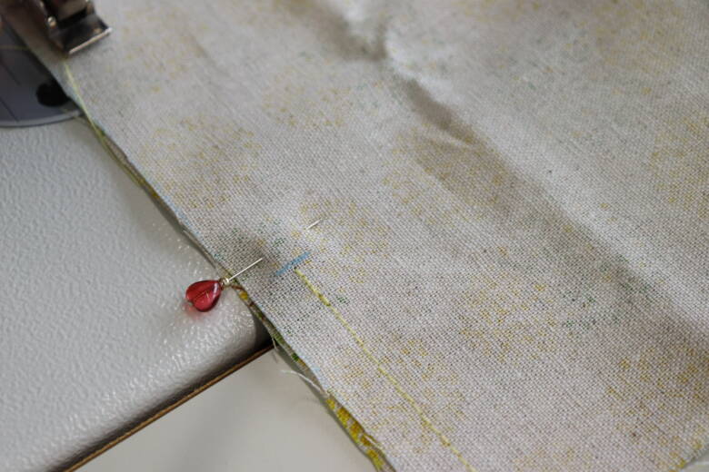 内生地を表生地の上に中表に置き、待ち針で止めます。