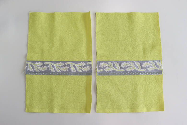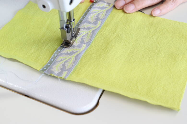 位置が決まったら、リボンが曲がらない様に先にチャコで線を引いてからリボンを待ち針で止めていきます。同じものを2枚準備して縫っていきましょう。