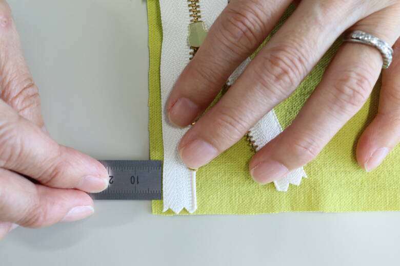 表生地の表側にファスナーを裏面を5㎜離したところに上向きにして置き、待ち針で止めます。