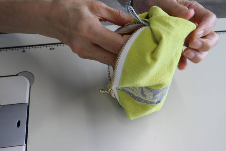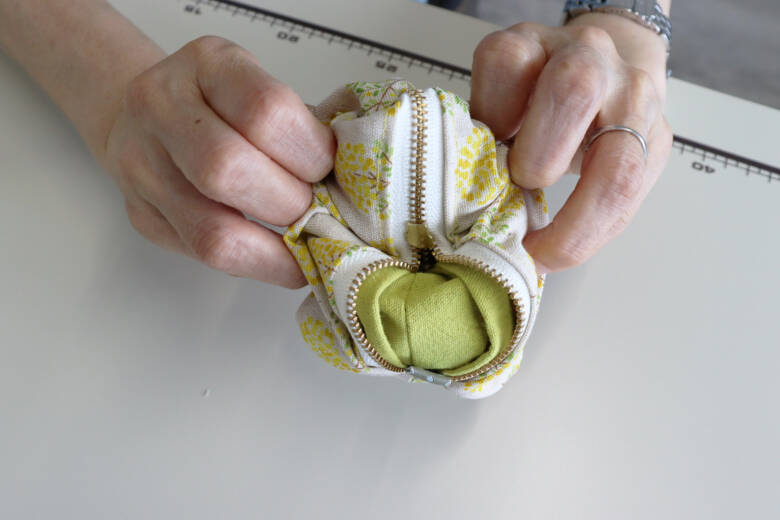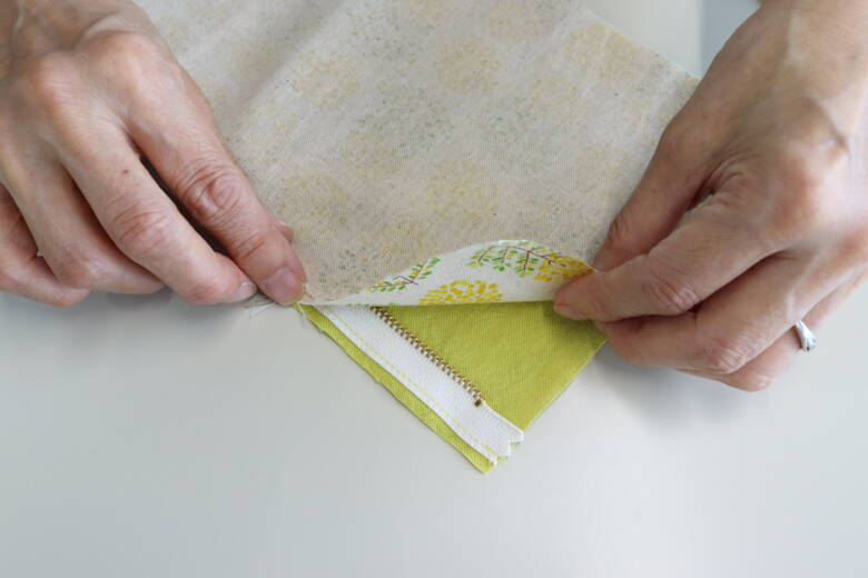 表生地のファスナー部分に底を合わせ、先程印を付けた部分を内側に畳みます。(左右とも畳んで下さい)