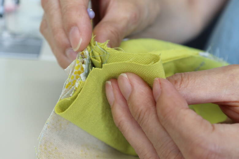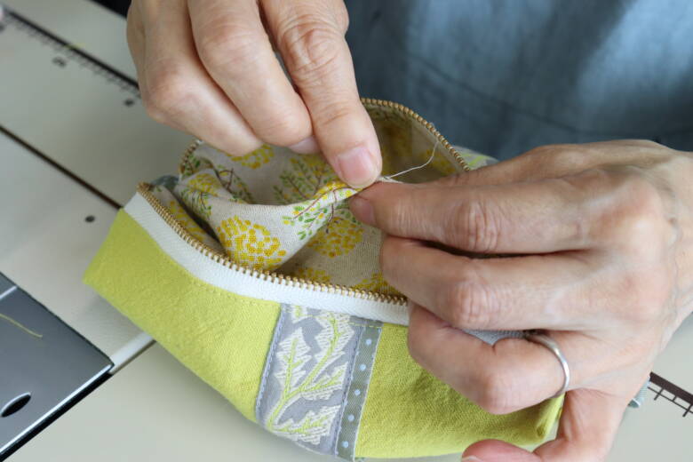 返し口にまつり縫いをして出来上がりです。摘まんでミシンで縫っても大丈夫ですよ。