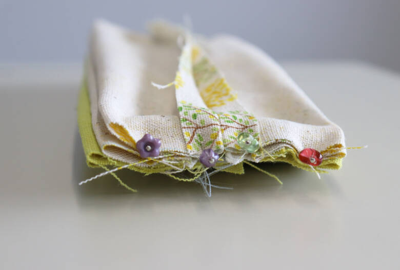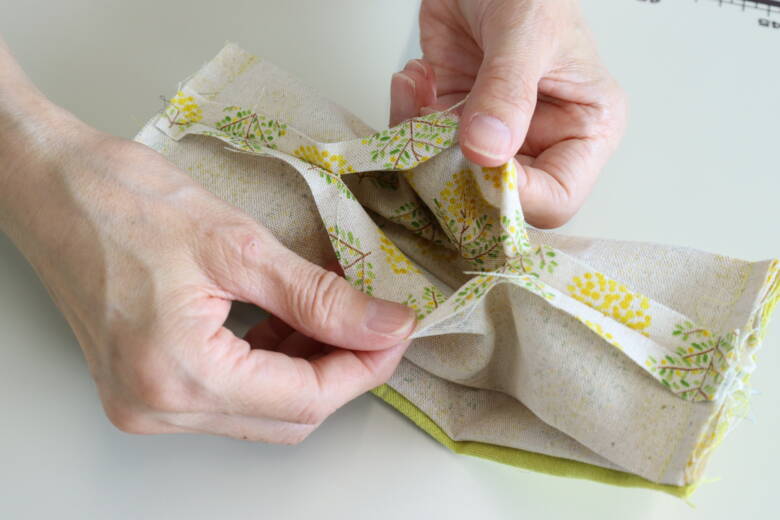 内生地も同じように畳んで待ち針で止めます。写真の様に畳めましたか?
