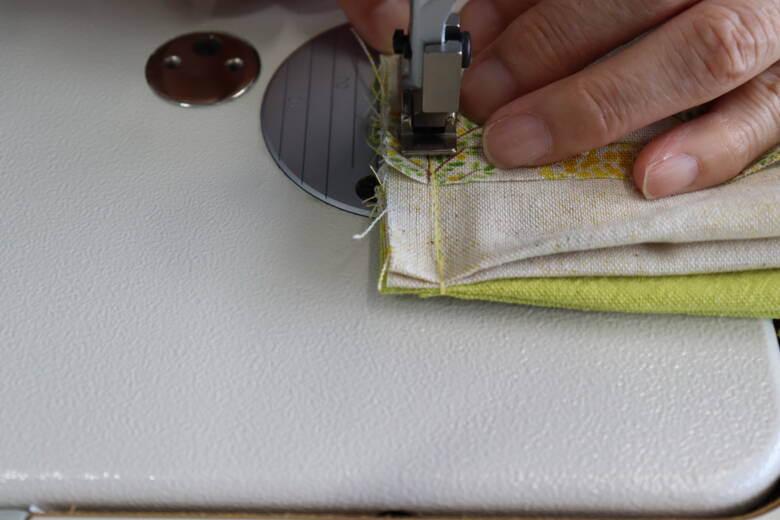 中心がズレない様にゆっくりと待ち針を外しながら、畳んだ部分を縫い代1㎝で左右共縫います。