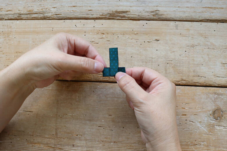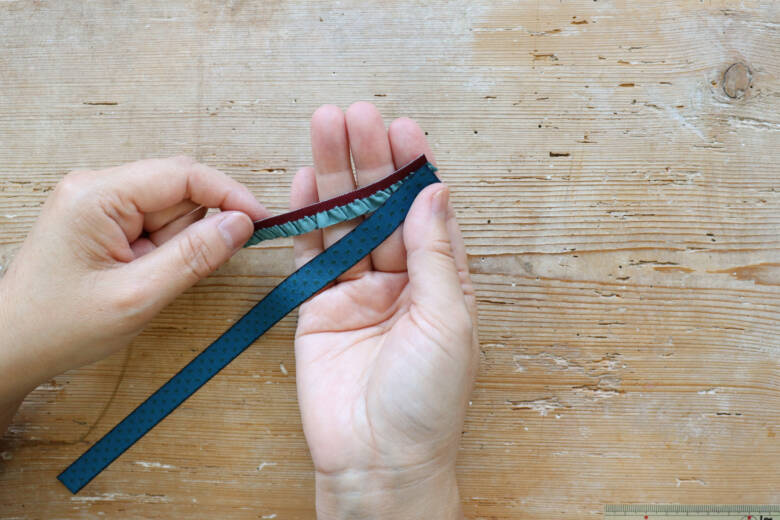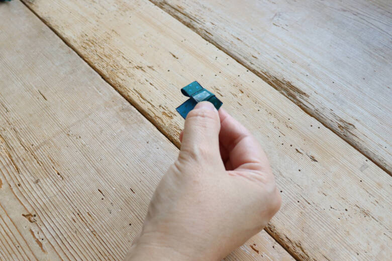 ③飾り用のリボン(長い方)の中央に両面テープを貼り、両端を中央に向かって折り、貼り付ける。