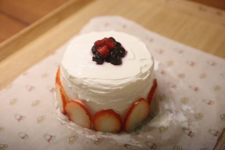 いっしょうもち担いで、ヨーグルトと食パンのケーキでお祝いしました。
