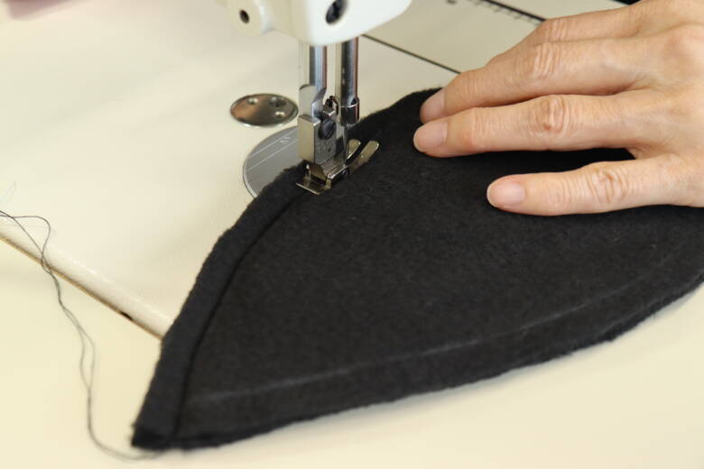 帽子の表側から、端から5㎜位のところにステッチを掛けます。