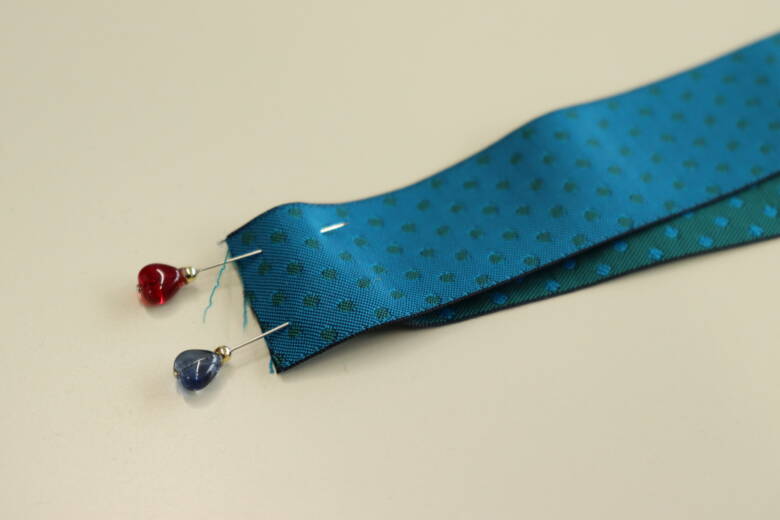 縫い終わったら、リボンに6等分の長さのところに待ち針を打っておきます。