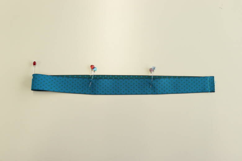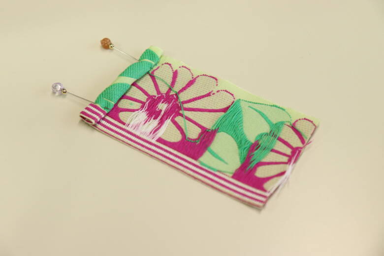 帯リボンを待ち針で止めます。