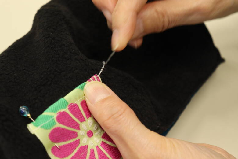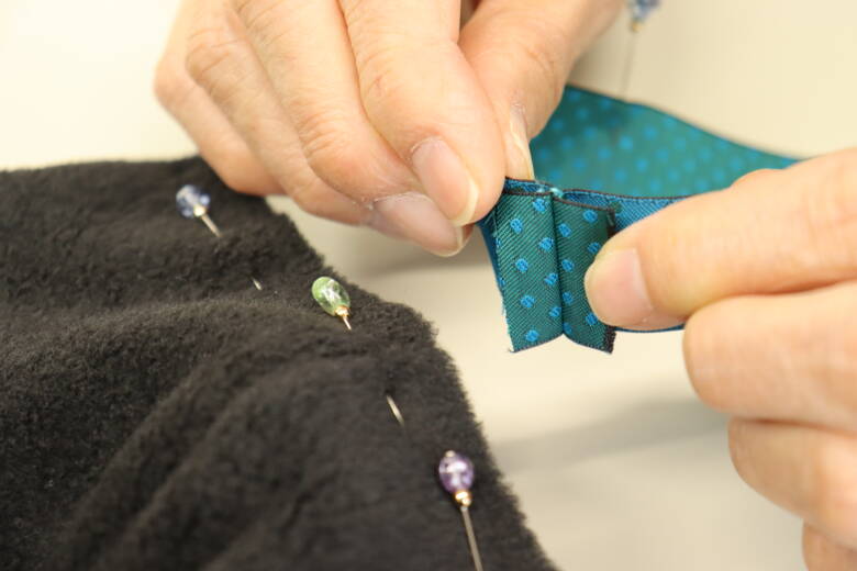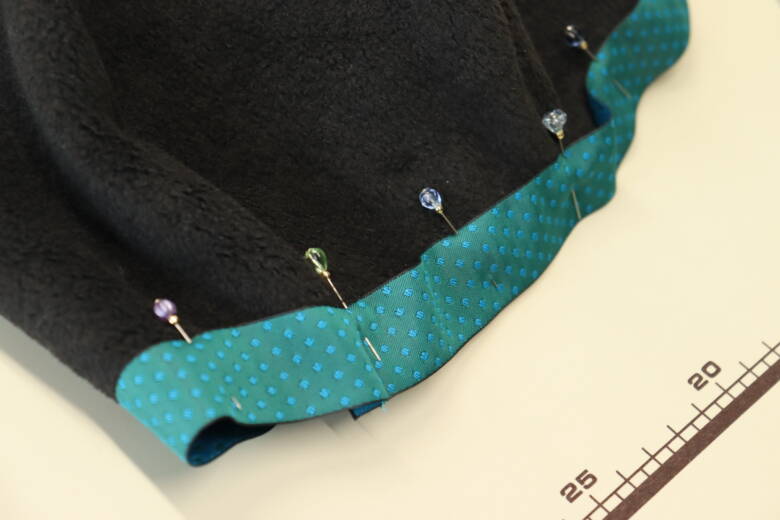 リバーシブルチロルを内側に入れて待ち針で止めます。
