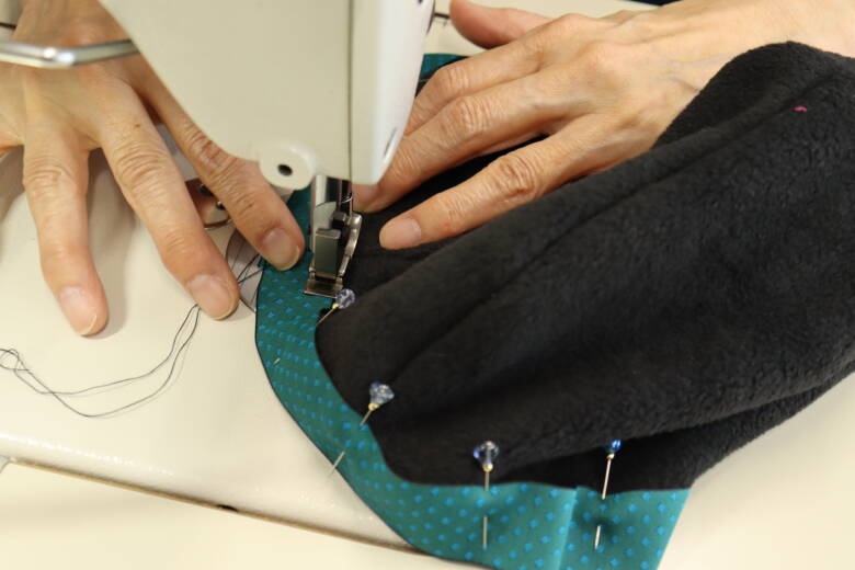 2枚縫い合わせた生地に更にもう1枚待ち針で止め縫います。