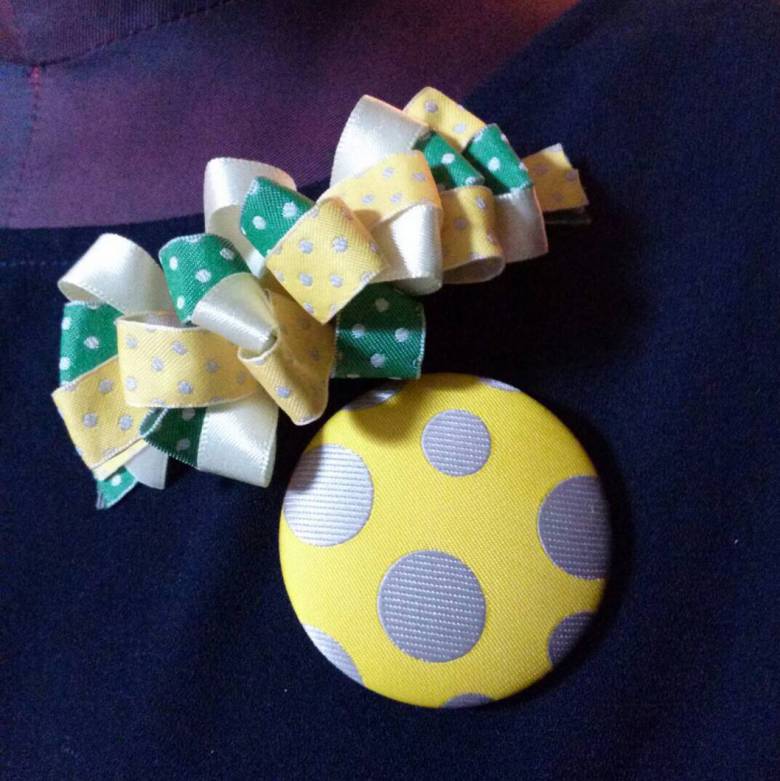 当日、松川レピヤンオリジナル「オリボンバッジ」にチロルリボンで手作りしたコサージュを合わせて胸元に付けている
