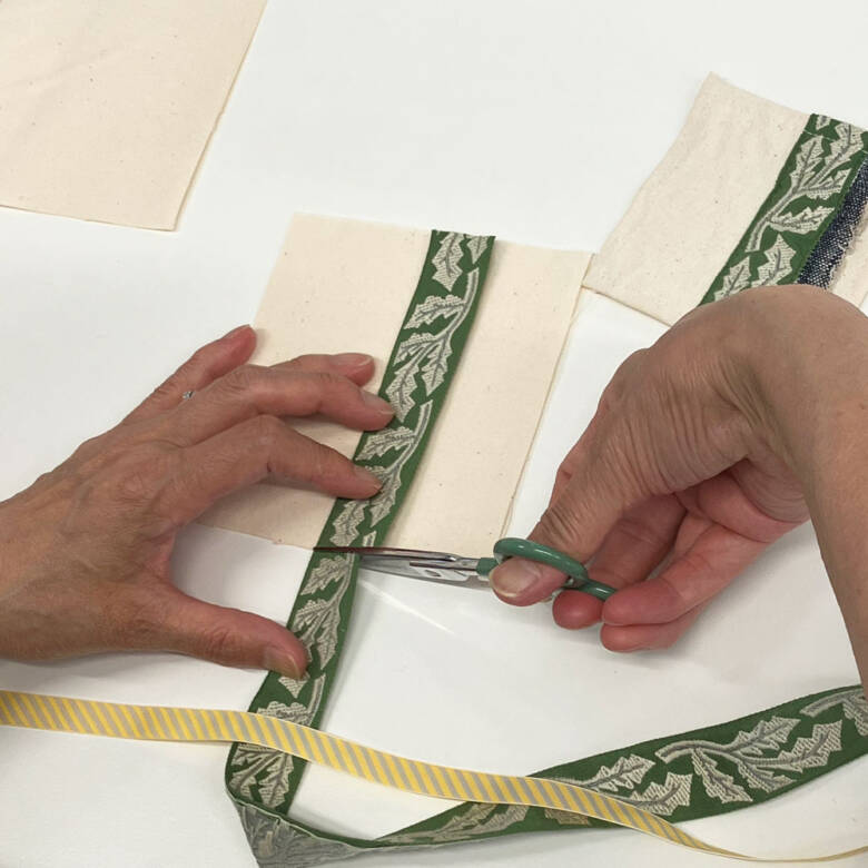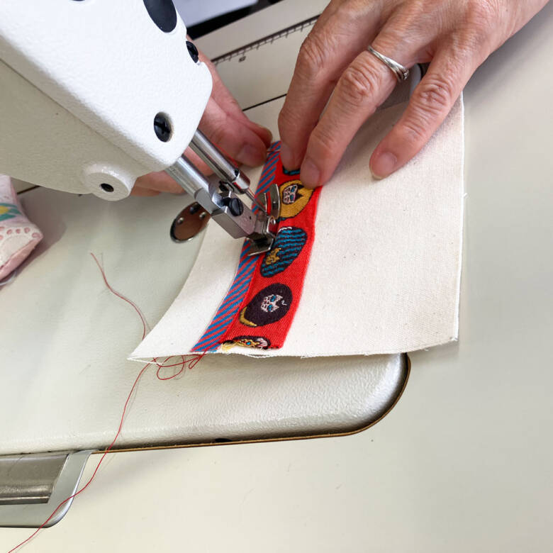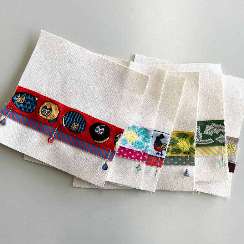 (今回はデザインの遊びで、あえて細幅のオリボン下部は縫いませんでした)