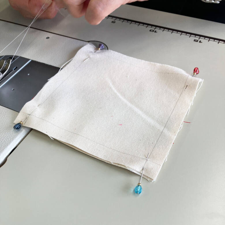 ⑥もう一枚のベースの布地を中表に重ねて、まち針で固定します。