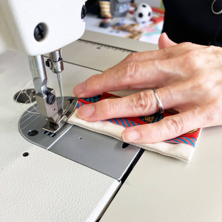 ⑧ひっくり返して、目打ちで角を出し、周囲にステッチをかけます。
