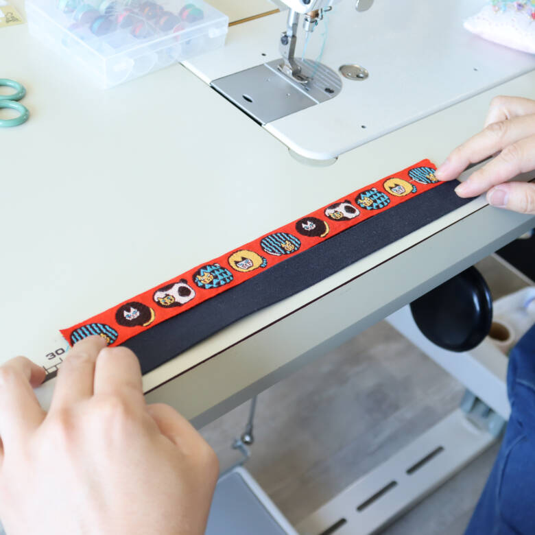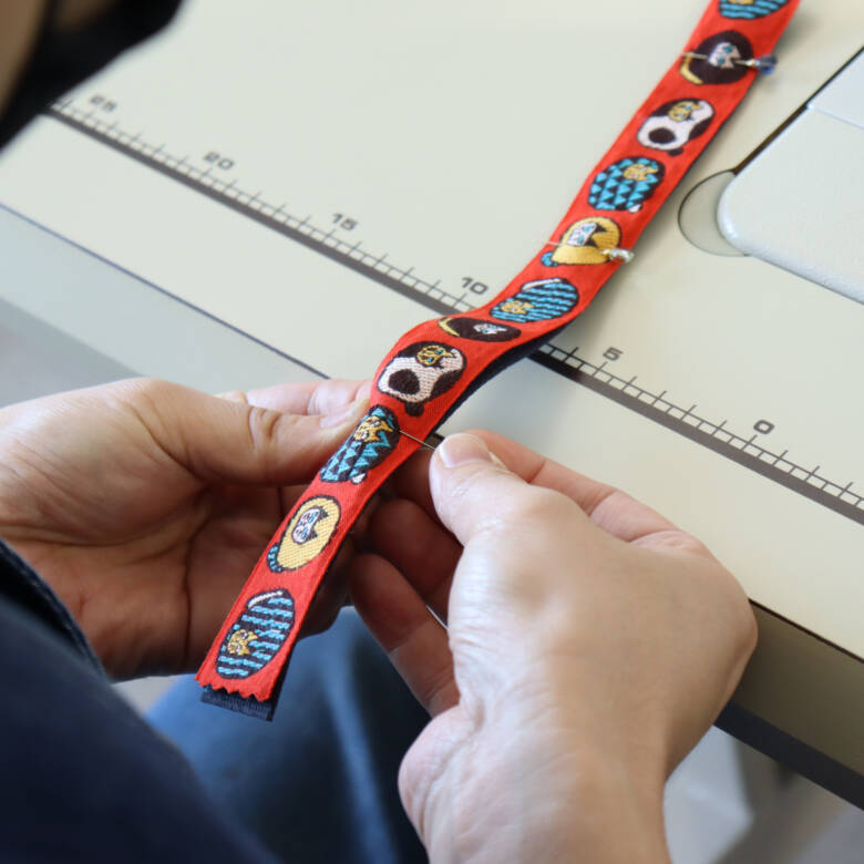 使用するのは、レピヤンリボンのオリジナルチロルまんまる猫/レッドと、コットンテープ/ネイビーです。