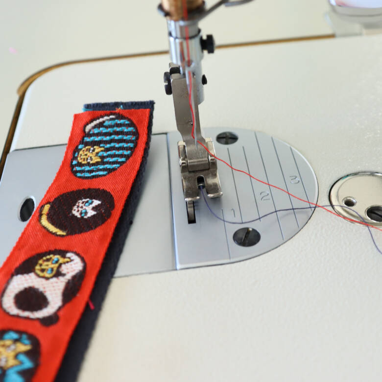 今回は上糸を赤に、下糸を紺色にしました。