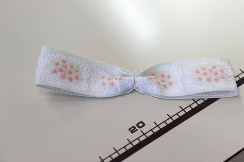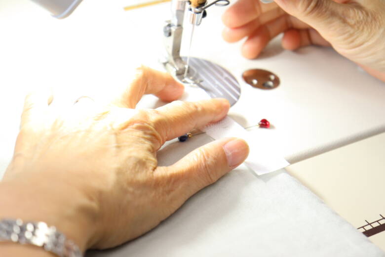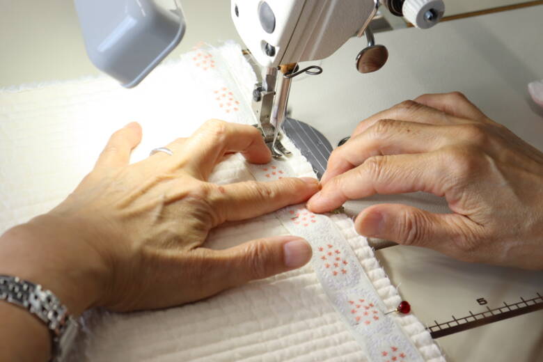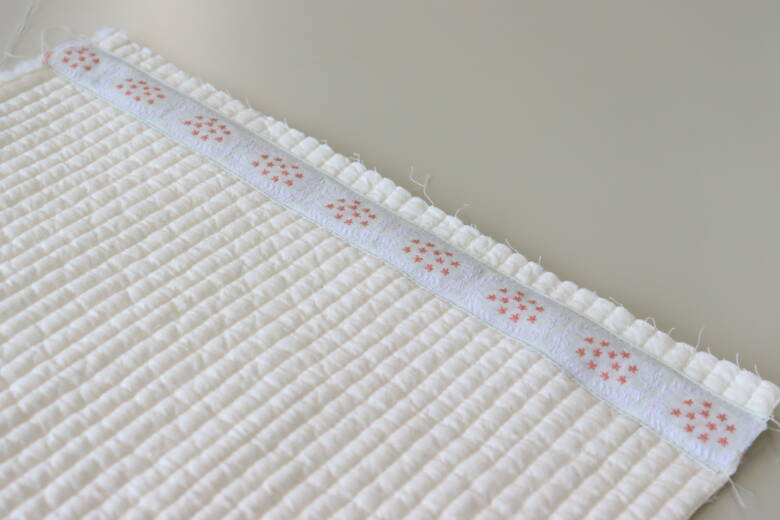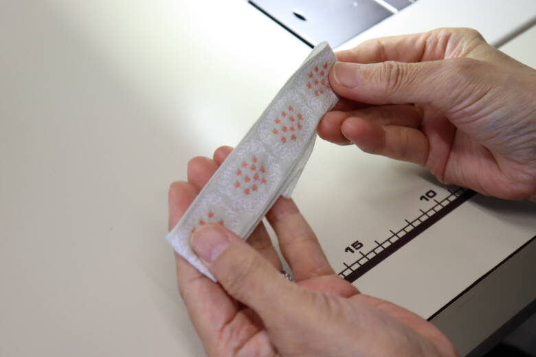 まず、表生地にチロルリボンを端から1cmのところに待ち針で止め両端にステッチをかけます。
