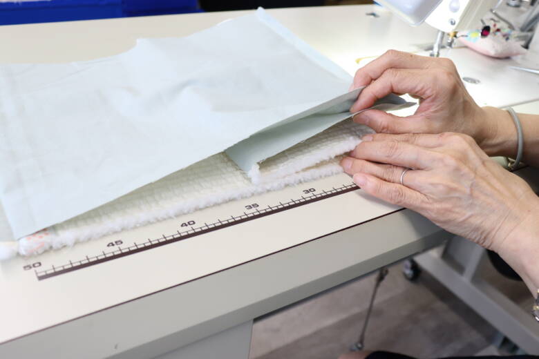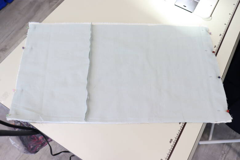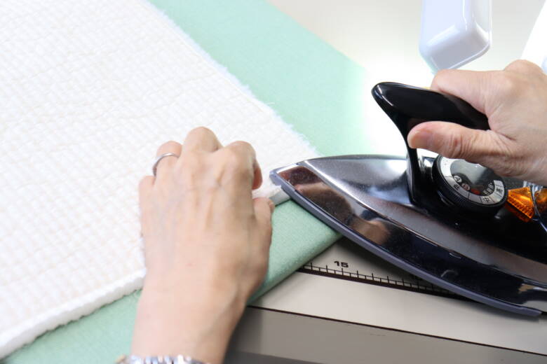 縫い終わったら、裏地の縫い合わせた部分と両端にアイロンをかけます。