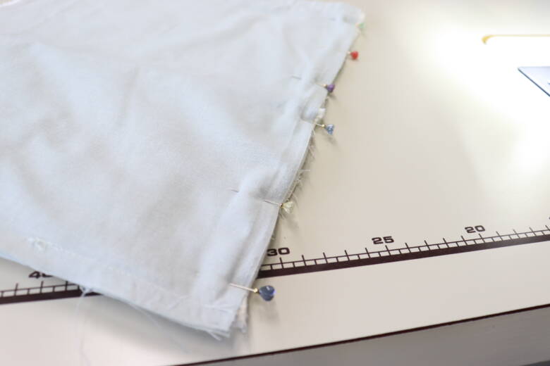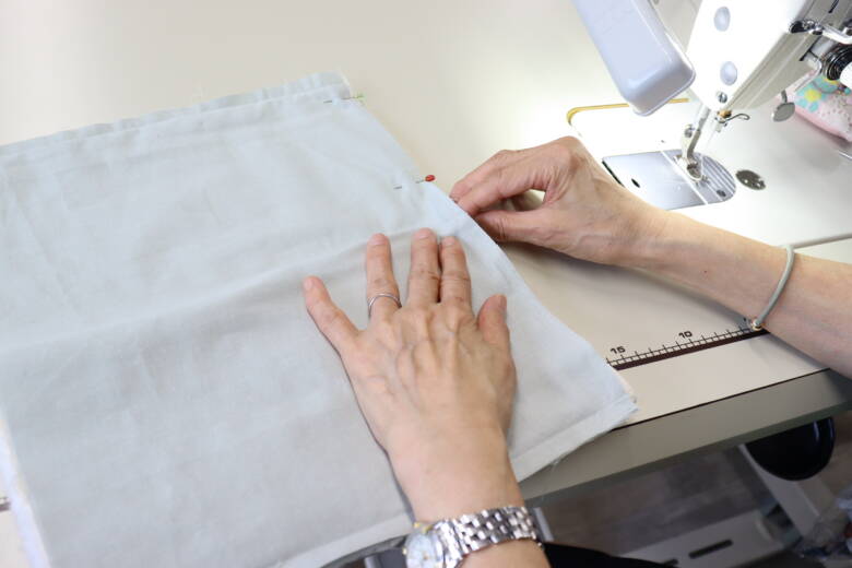 畳んだまま、左右の端を待ち針で止めて端から1cmのところを縫います。