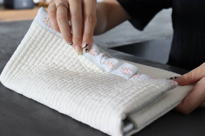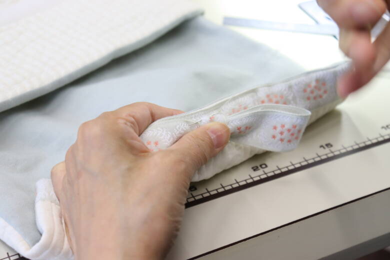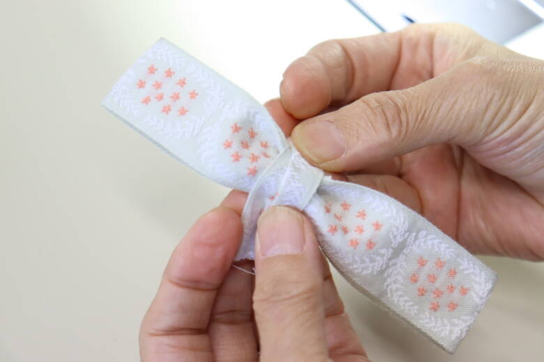 そして、ここが少し難しいのですが、リボンが付いていない側の端を表生地と裏生地の間に畳んで入れます。