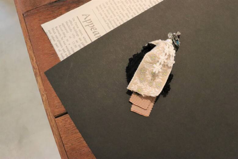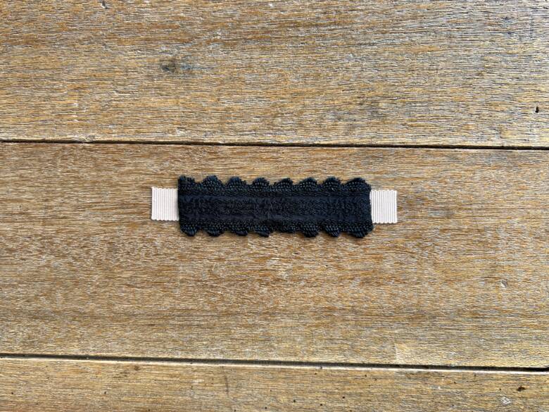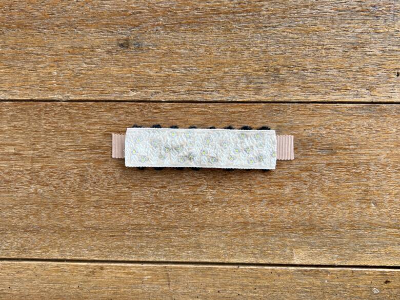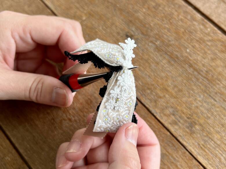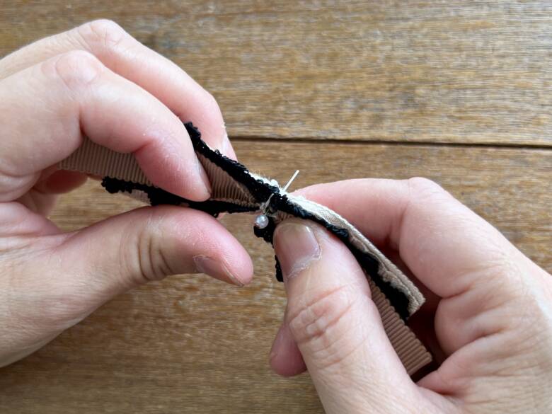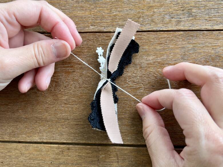 ① グログラン→黒リボン→レピヤンリボン→小花レースリボン の順で重ねます。