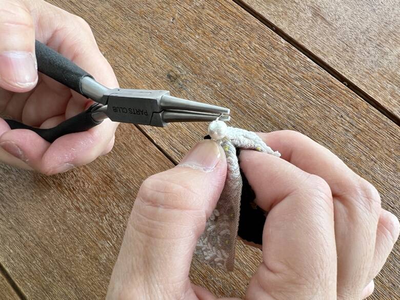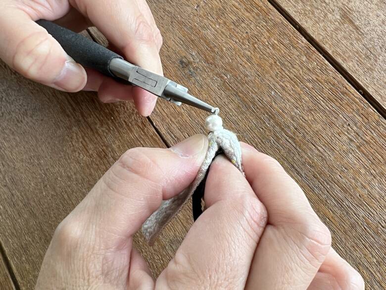 ⑦ イヤリングのパーツを付け、フック状の部分をしっかり閉じます。
