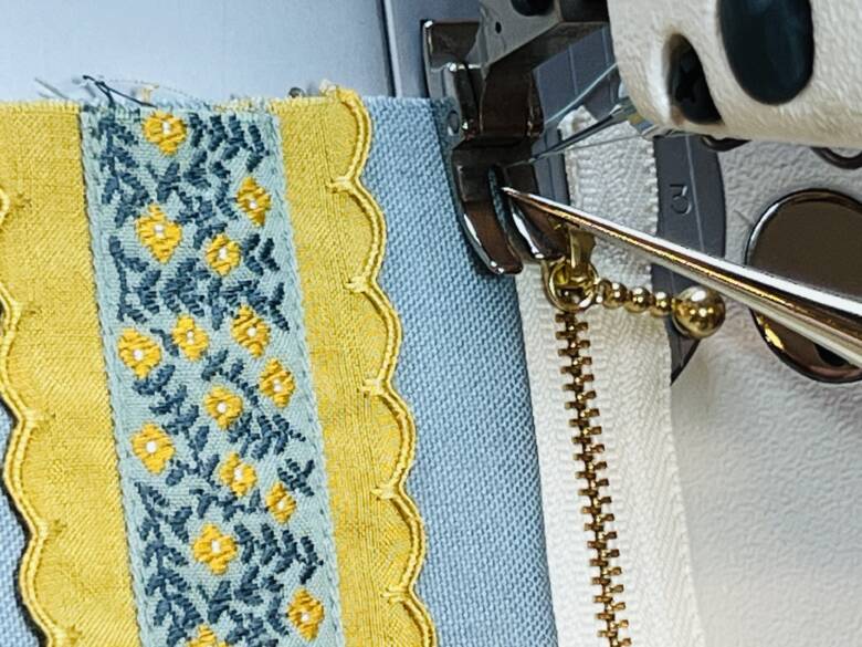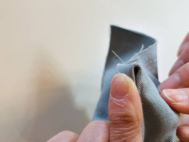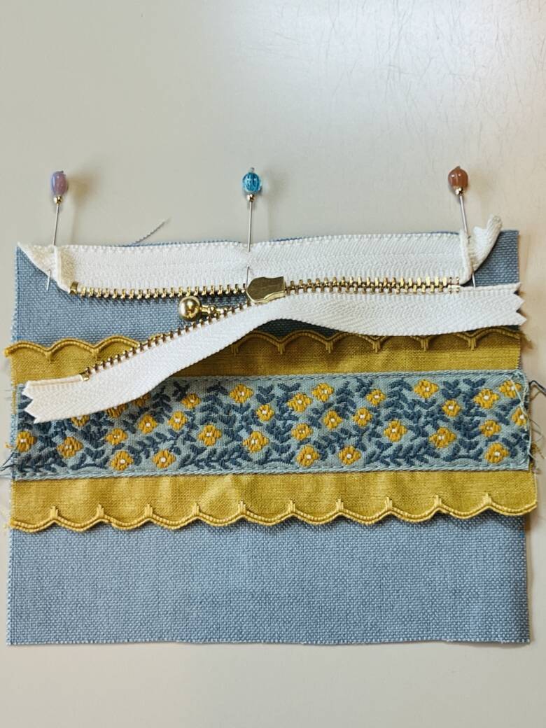 ファスナーの先の方は直角に折り上げて待ち針で止めておきます。