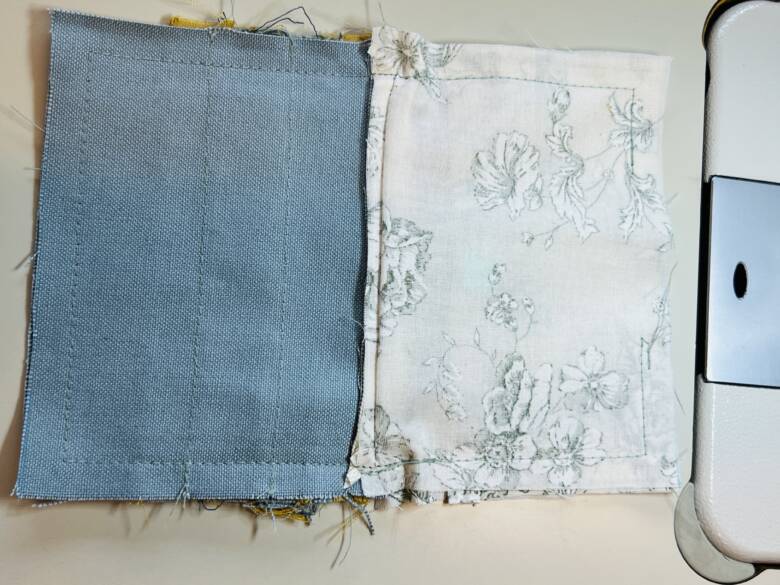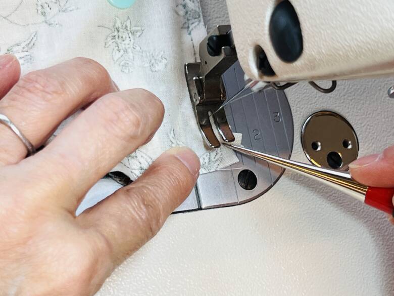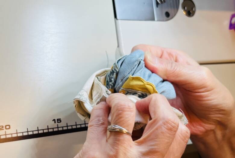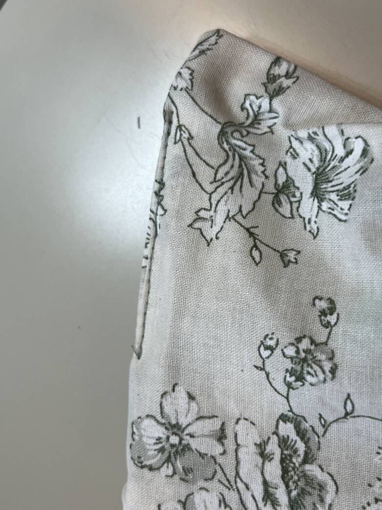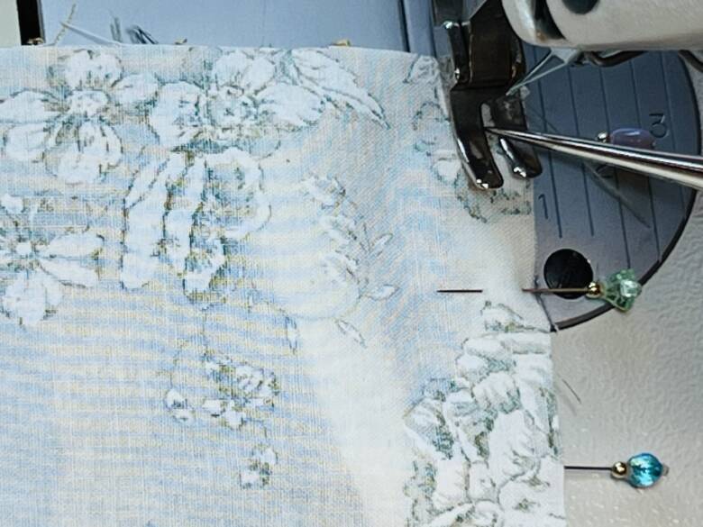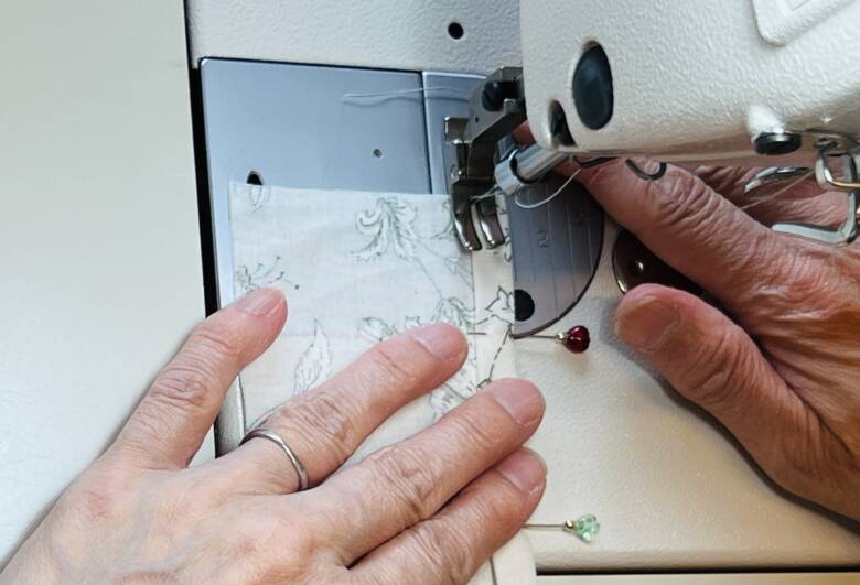 その上に内生地を乗せて待ち針で止めて3枚一緒に端から5㎜のところを縫います。