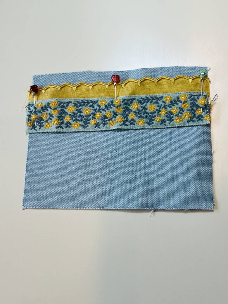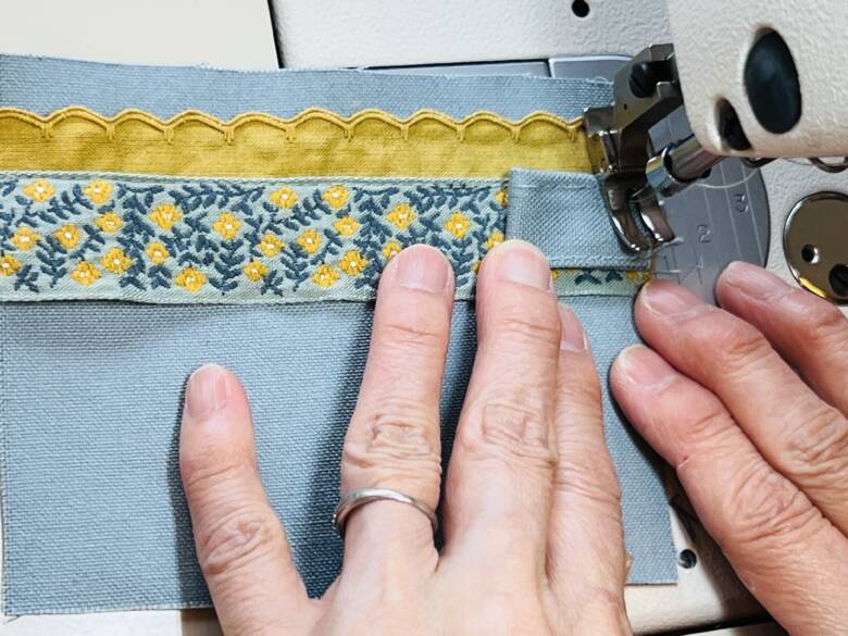 チロルリボンがステッチされた表生地の上部1㎝のところにリング用の生地を仮止めしておきます。