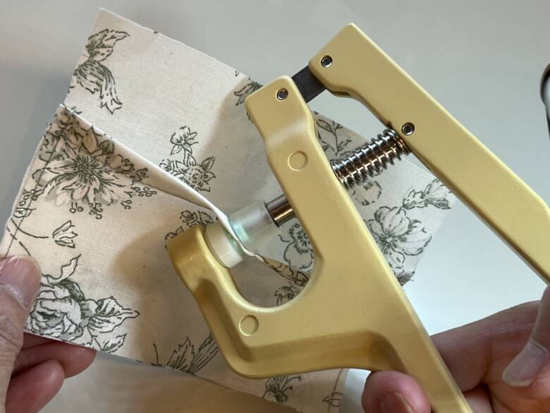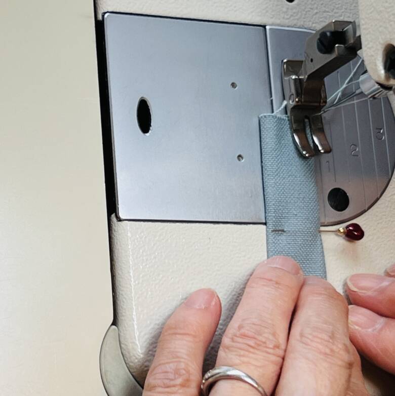 5㎝×4㎝のリング用生地の、5㎝側を2㎝になる様にたたみ両側にステッチを掛けます。