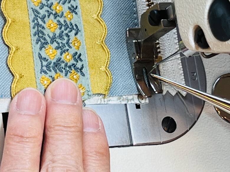 反対側のチロルリボンは上部の方に配置してみました。こちらもステッチを掛けておきます。