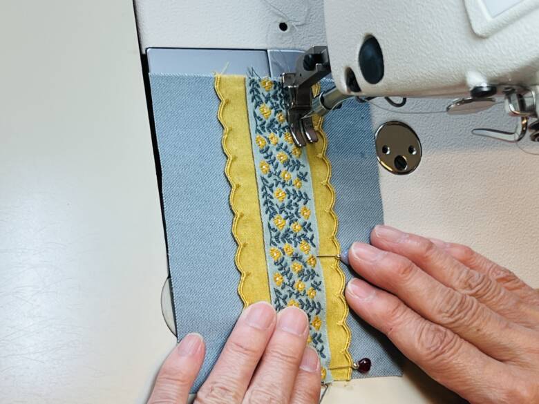 表生地にお好きな場所にチロルリボンを配置します。チロルリボンの両側にスカッラプリボンを挟んでみました。