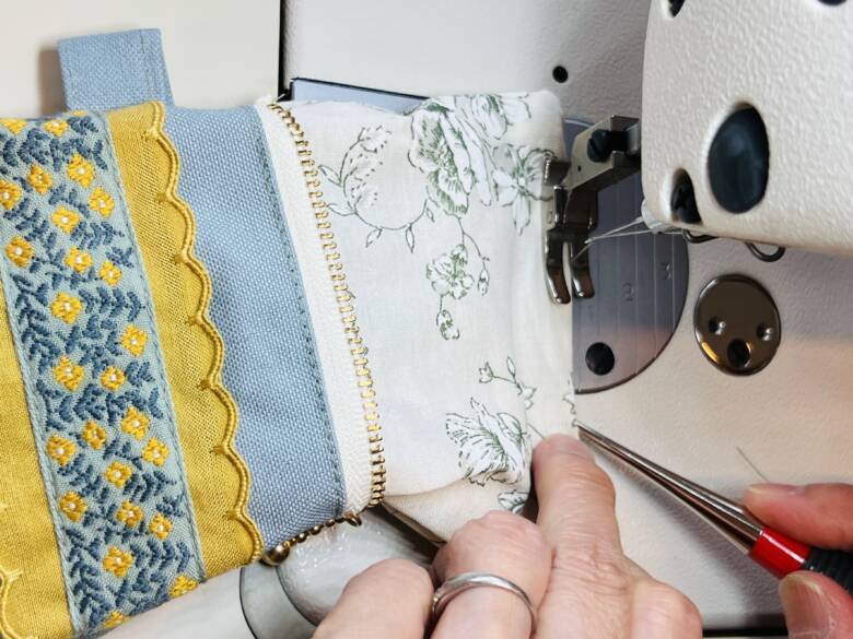 表生地・内布生地どうしにして広げ、待ち針で止めてからミシンで一周縫います。内生地の底の部分に返し口用に縫わない部分を作っておきます。(この時ファスナーは半分開けておきます)