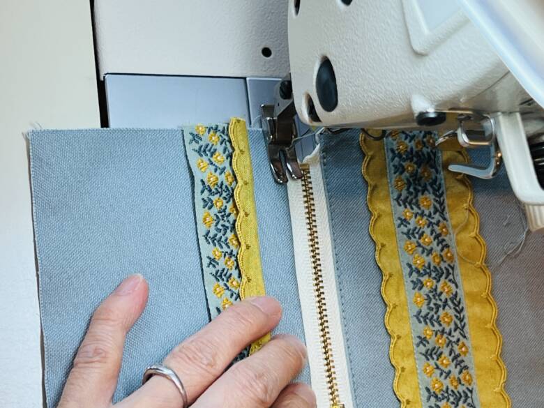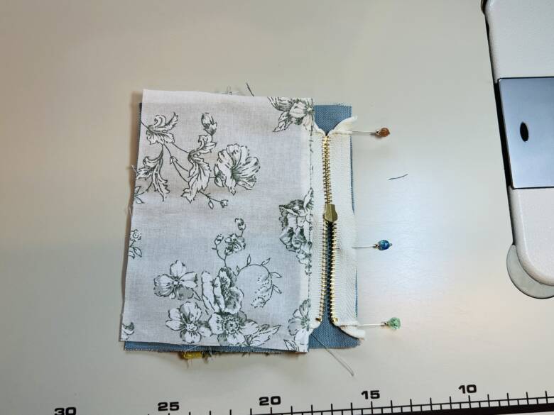 次にファスナーを付けます。表生地にファスナーを裏面が上になる様に乗せます。