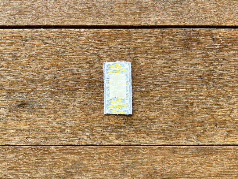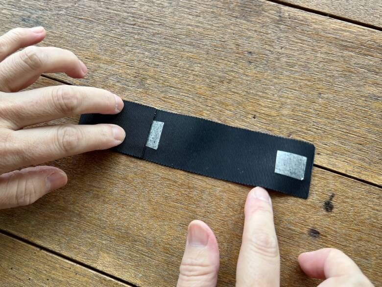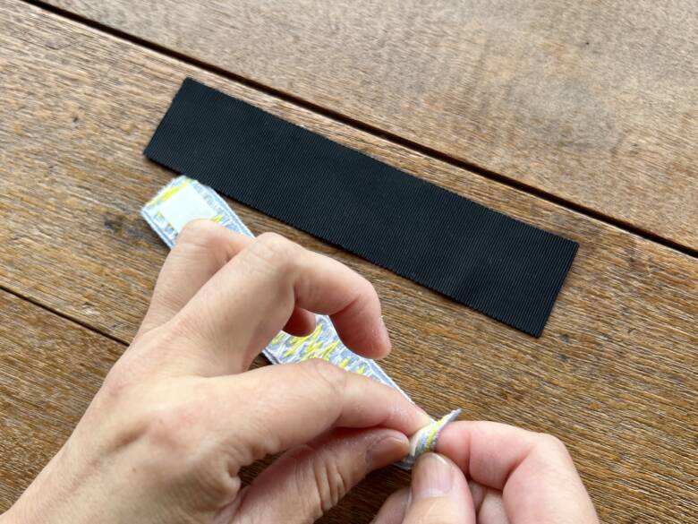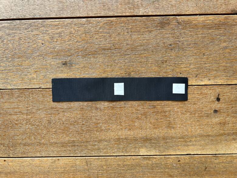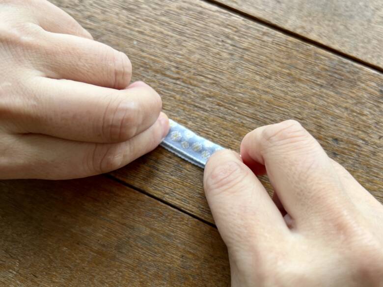 ④5cmのマーガレットリボンの裏に両面テープを貼り、縦半分(きっちり半分にしない方が味がでます笑)にします。