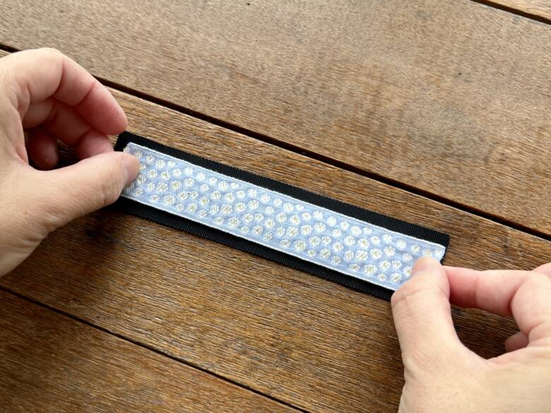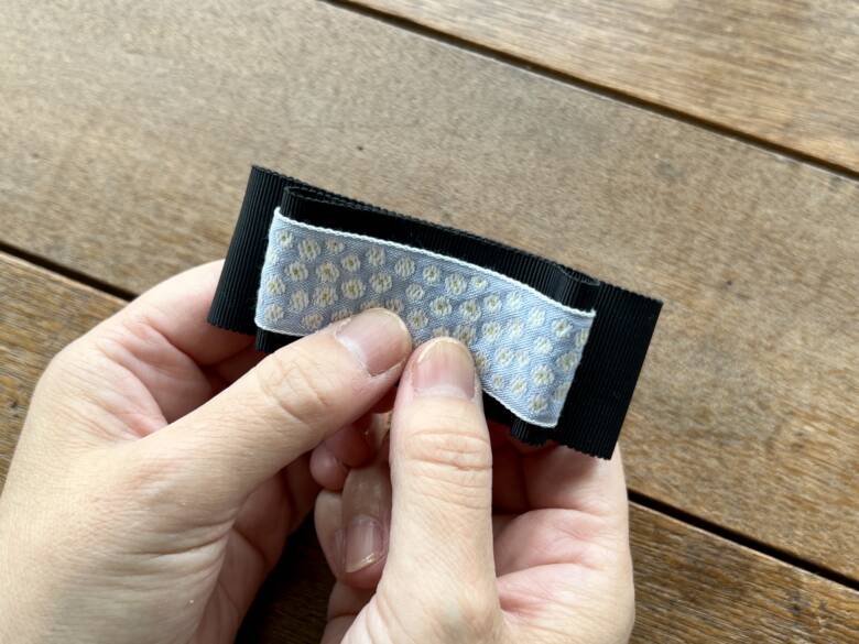 ②16cmのグログランテープに16cmのマーガレットリボンを両面テープで貼り、折ります。