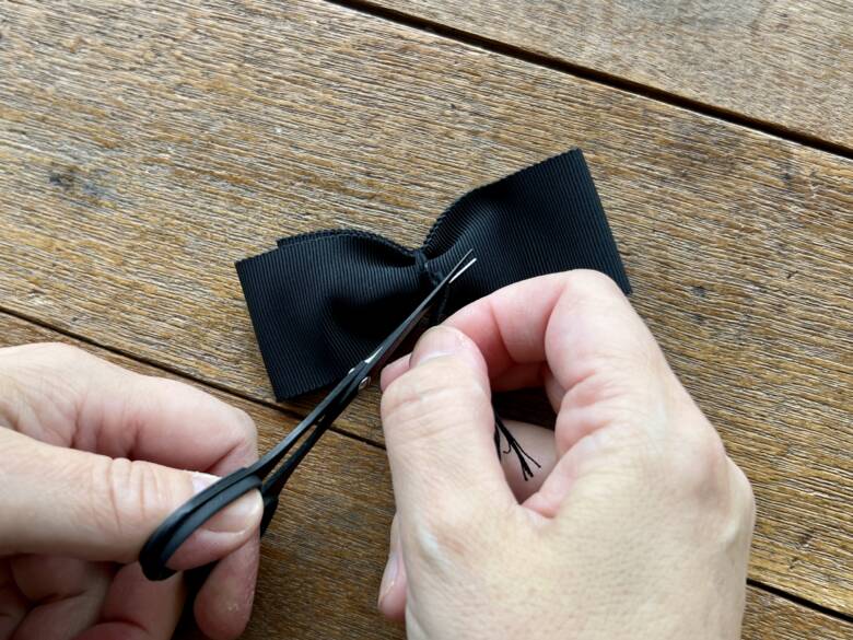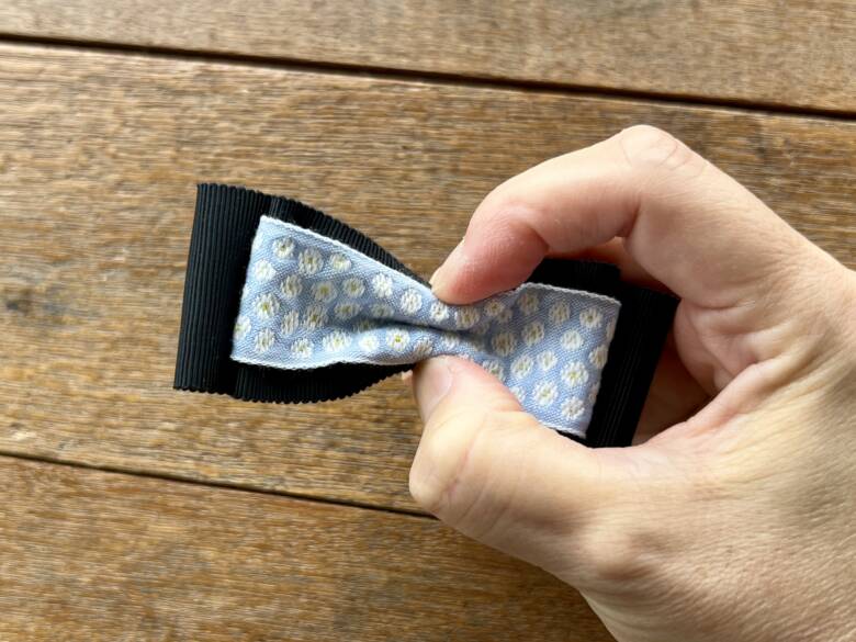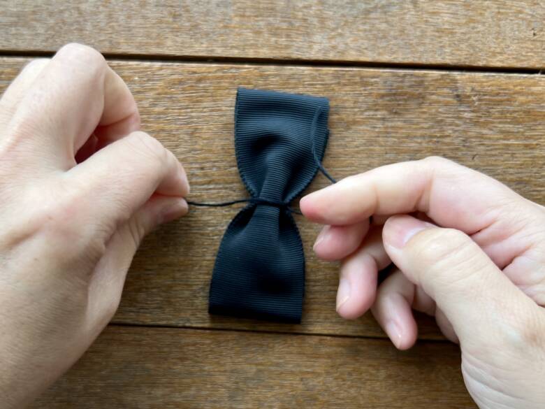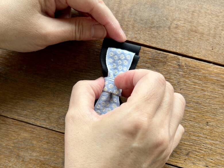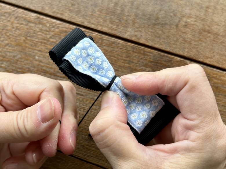 ③ ①の上に②を重ね、りぼん型にし、中央を糸で固定します。