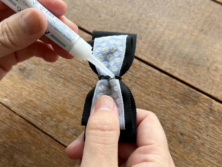 ⑤ ③の糸で縛った部分一周ぐるっとボンドを付け、④を巻きつけます。