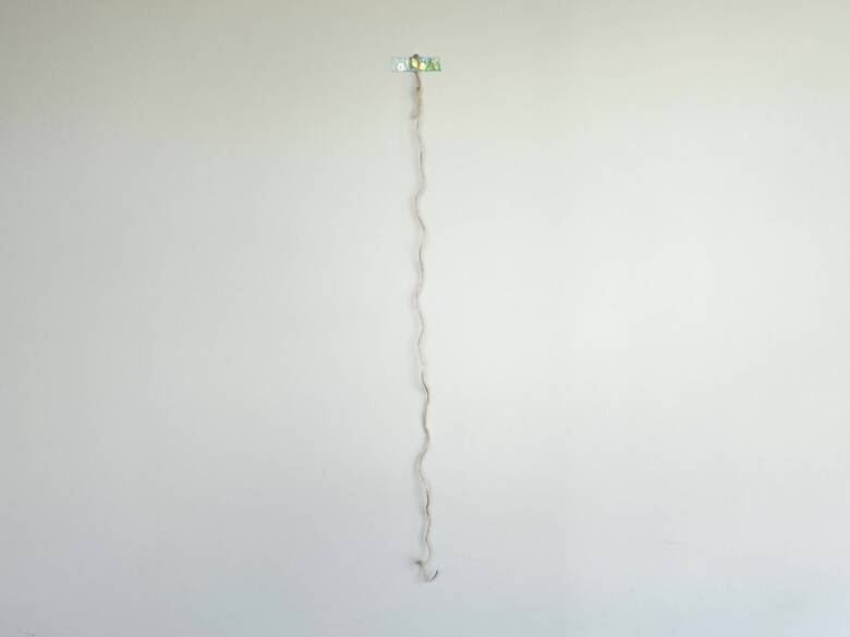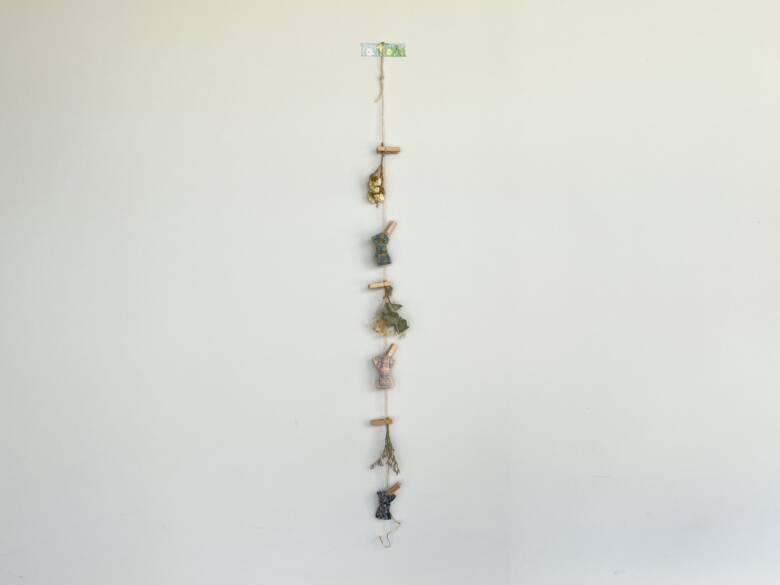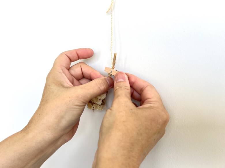 ④麻紐を壁に貼り、ウッドピンチで取り付けます。