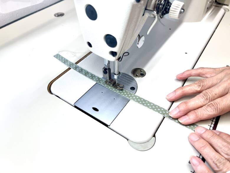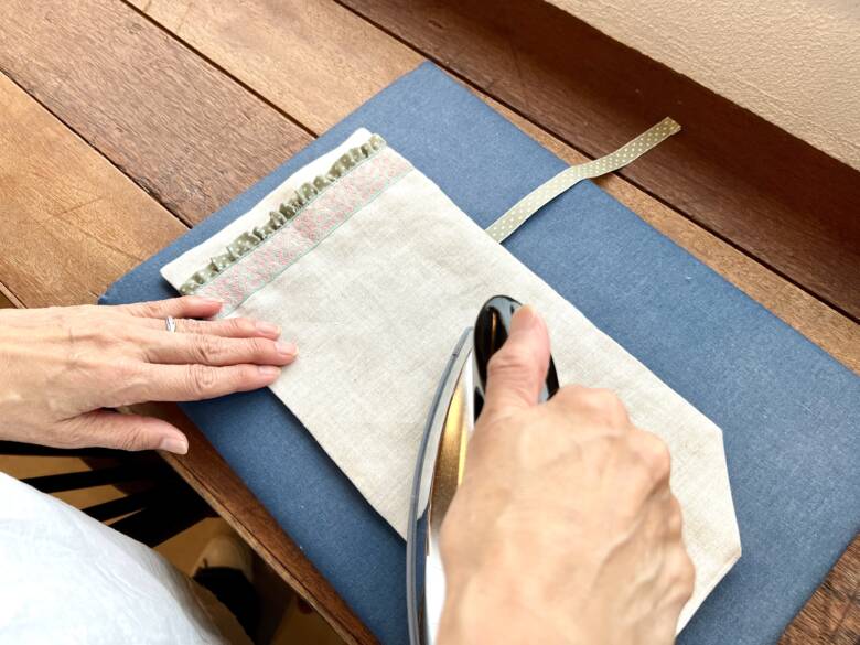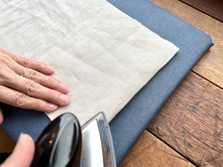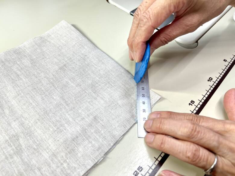 生地の端から、7㎝と14cmのところに印を付け生地を畳んでアイロンを掛けます。