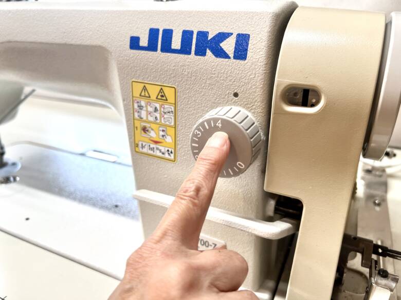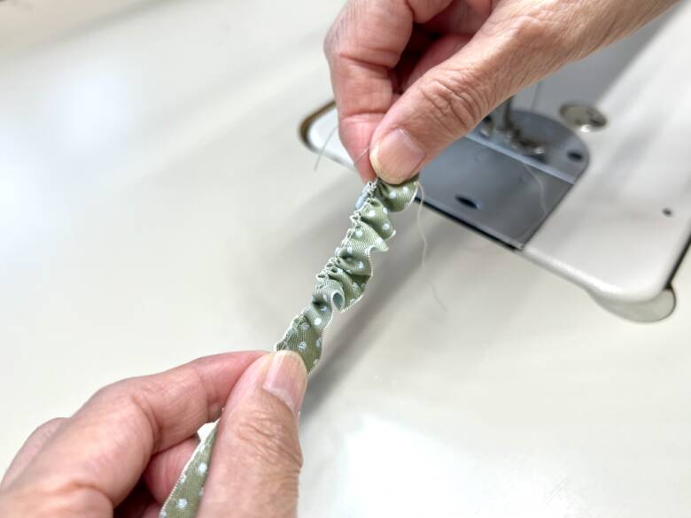 ミシン目のダイヤルを一番大きくして、リバーシブルリボンの端にステッチを掛けて、糸を引っ張ってフリルを作ります。