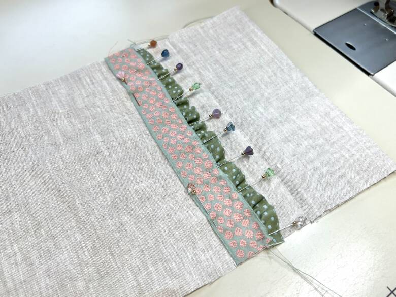 14㎝のところにしおり用の20cmのリバーシブルリボンを、更に5㎝横に18㎝のリバーシブルリボンを配置して仮縫いをします。
