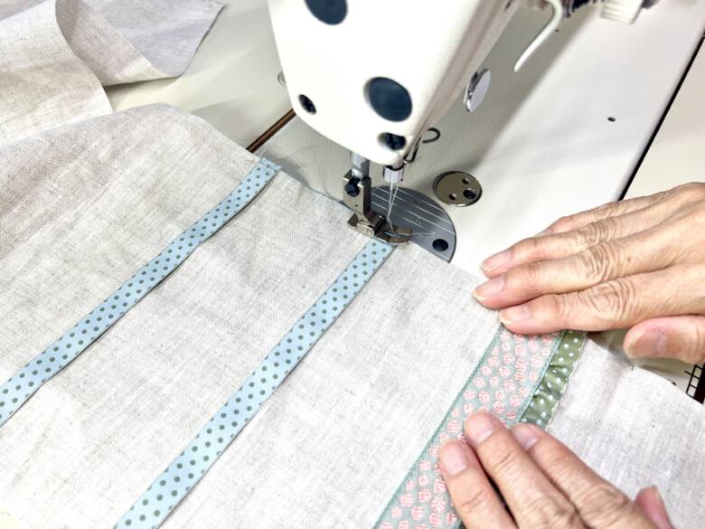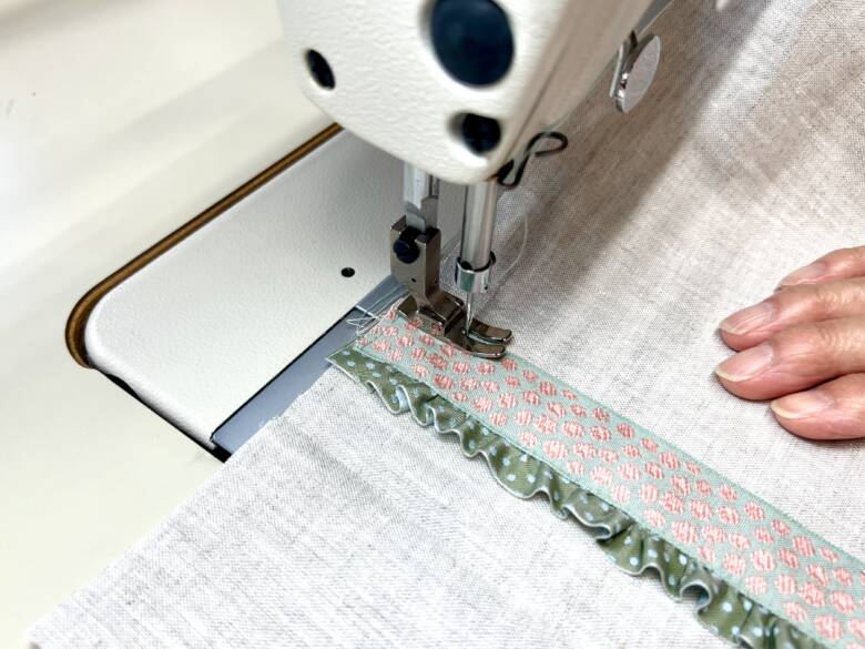 折り曲げた端の9㎝のところにチロルリボンとフリルを縫い付けます。