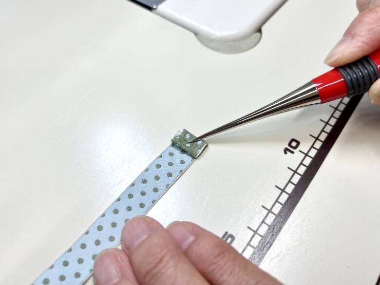 しおり用のリバーシブルリボンの片方の端を三つ折りで縫っておきます。